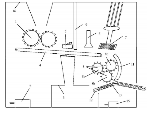 在污染土壤的修复过程中,最要的部分是将挖出的污染土壤进行土壤破碎成小颗粒 状,并与修复药水进行充分的接触达到修复的目的。目前,土壤破碎很多并不充分,存在 大量块状土壤及碎石,不能达到充分修复的目的。为了克服现有技术中存在的不足,本实用新型提供一种用于土壤破碎 及修复的机械装置,内部设置了多个破碎装置、喷雾装置和筛选装置,可以有效的对土壤进行破碎和修复,同时剔除大块碎石,减少对机器的损耗,同时保证更好的已修复土壤。