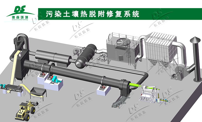 热脱附修复工艺流程包括:供料系统、热源系统、热脱附旋转窑系统、二燃室系统、尾气收集除尘系统、余热循环利用系统等,实际工艺将根据污染土壤案例具体情况优化调整,以实现最优化工艺设计及设备配套。其核心设备包括:旋转式热脱附窑,二燃室,热交换器等。